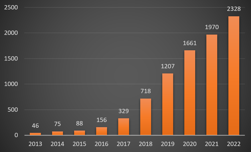 自2011年以來,人工智能(Artificial Intelligence,AI)技術(shù)經(jīng)歷了飛速發(fā)展,成功地跨越了科學與應(yīng)用之間的技術(shù)鴻溝,在圖像分類、語音識別、知識問答、無人駕駛等方面實現(xiàn)了重大的突破,進入了蓬勃發(fā)展的時期。而在天文學領(lǐng)域,AI的應(yīng)用也在逐年加速增長。通過對arXiv上涉及AI在天文研究方面的論文進行統(tǒng)計,發(fā)現(xiàn)從2013年的46篇增長到2022年的2328篇,十年間增長了50倍之多。