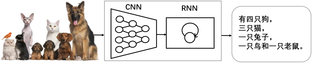 圖5展示了一個圖像描述(image caption)任務(wù)的框架,由卷積神經(jīng)網(wǎng)絡(luò)(CNN)和循環(huán)神經(jīng)網(wǎng)絡(luò)(RNN)構(gòu)成。該模型可以識別圖像中的對象,并用文字描述圖像內(nèi)容,即通過AI模型使計算機擁有 “看圖說話”的能力。這種任務(wù)涉及到圖像和描述文本兩種不同的信息模態(tài),如何讓AI模型充分利用多模態(tài)信息并進行交互,也是未來研究的一個趨勢。