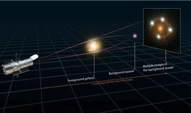 遙遠(yuǎn)類星體發(fā)出的光,在經(jīng)過前方星系的引力勢阱的時(shí)候發(fā)生了彎曲,所以光在到達(dá)望遠(yuǎn)鏡的時(shí)候所看到的圖片會像最右邊圖像所顯示的那樣。(圖源:Martin Millon/Swiss Federal Institute of Technology Lausanne;Hubble Space Telescope/NASA)