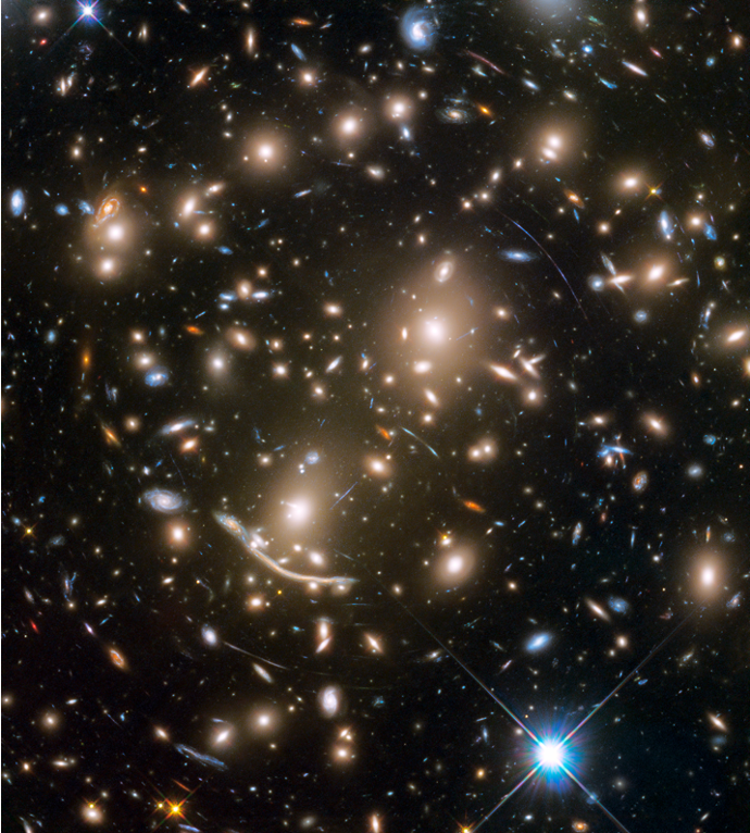 后發(fā)星系團(tuán)里面觀測到的強(qiáng)引力透鏡效應(yīng)。圖中的弧線都是背景星系發(fā)出的光被后發(fā)星系團(tuán)強(qiáng)大的引力勢阱彎曲而產(chǎn)生的。(圖源:Hubble Space Telescope in the final Frontier Fields observations)