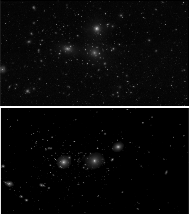真實(shí)的后發(fā)星系團(tuán)(上圖)和模擬的后發(fā)星系團(tuán)(下圖)在可見光波段圖像的比較。