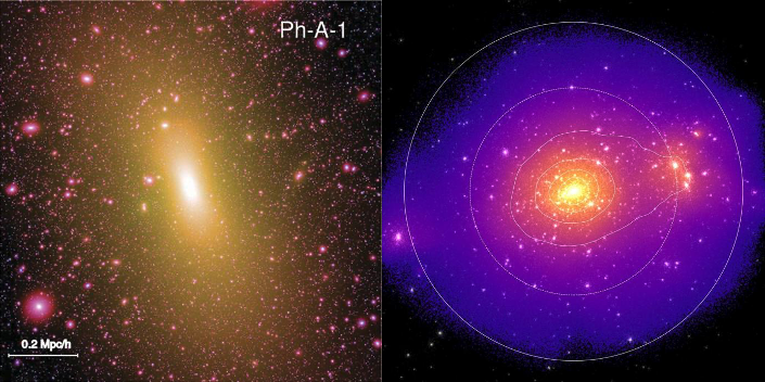 左圖是鳳凰星系團(tuán)模擬中的一個(gè)星系團(tuán)[2]; 右圖是300星系團(tuán)項(xiàng)目的中的一個(gè)模擬星系團(tuán)[3]。